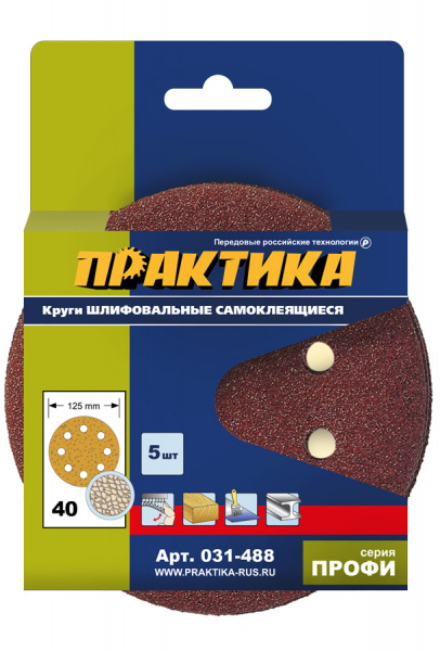 ПРАКТИКА Круги шлифовальные на липкой основе (5шт) 8 отверст., 125мм, P 40, картон. подвес 031-488 оптом