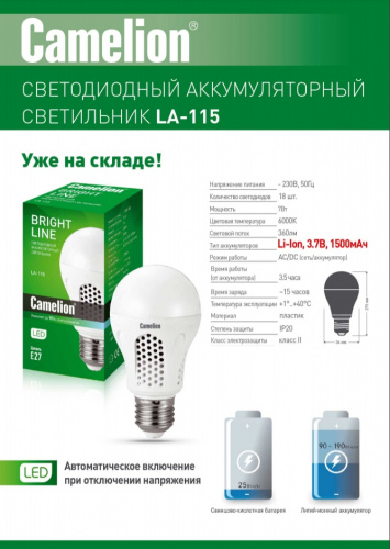 Аккумуляторный светильник LA-115 обеспечит привычную для вас работу светильника при отсутствии питания от энерго-подающей компании. У вас всегда будет освещение дома или на даче. Используется как обычная лампа с цоколем E27, продолжает работу от аккумулятора при отсутствии электричества.