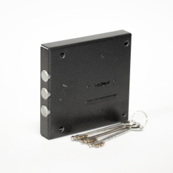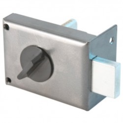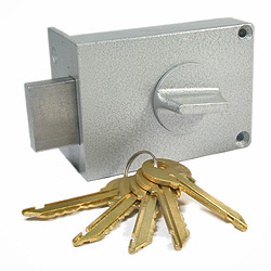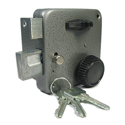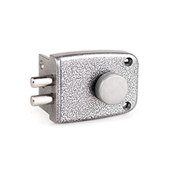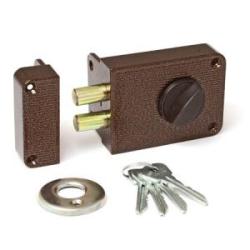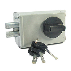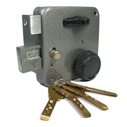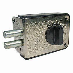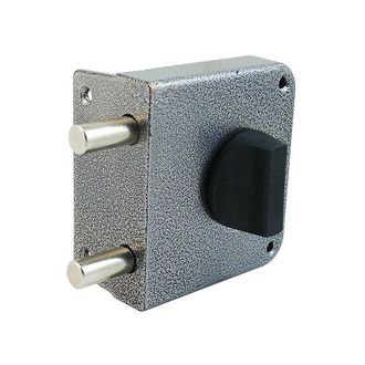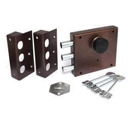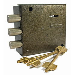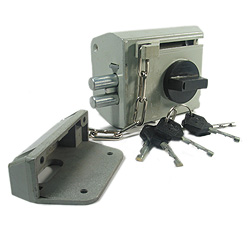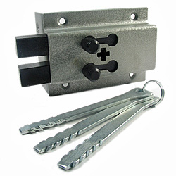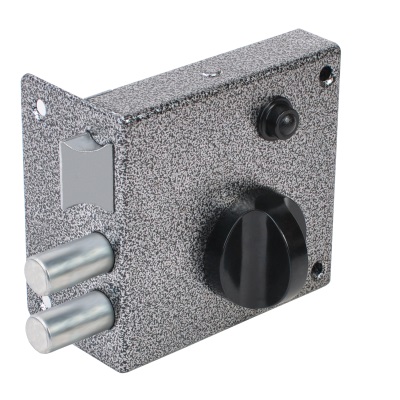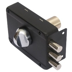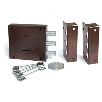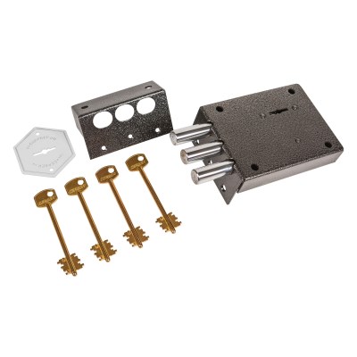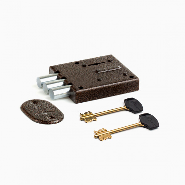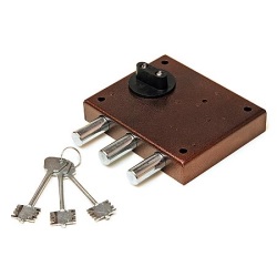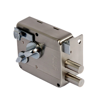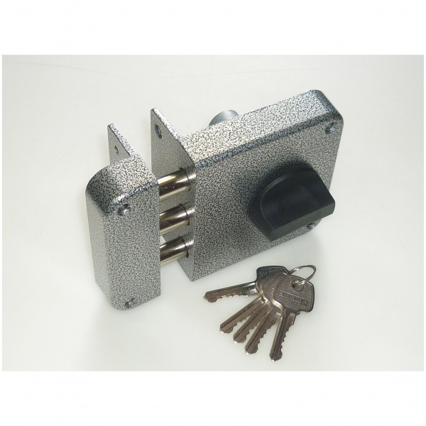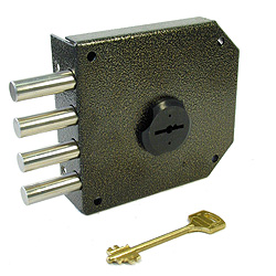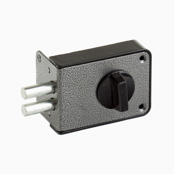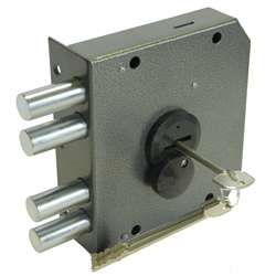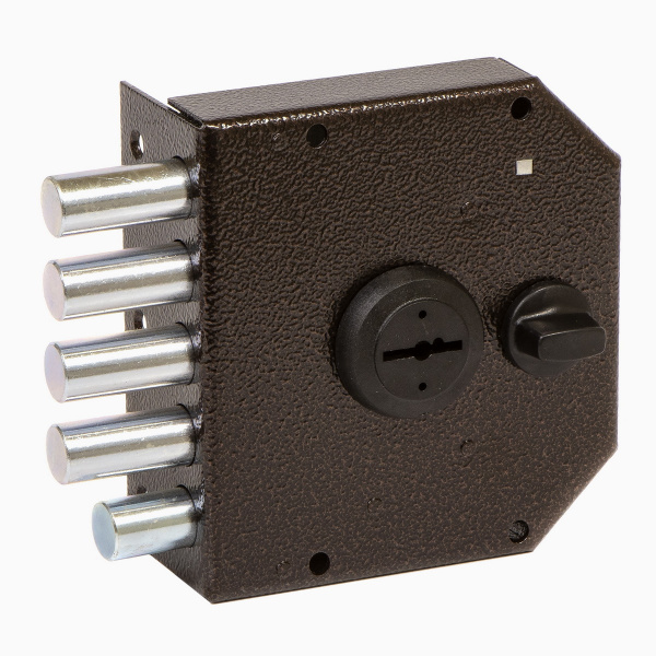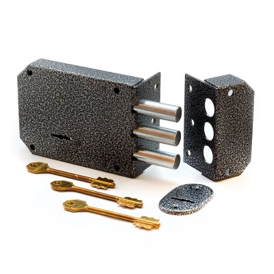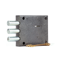 Запорный механизм располагается в закрытом корпусе. При повороте ключа в замке ригельная пластина перемещает ригели в направлении ответной части, расположенной на косяке двери. Так происходит процесс закрытия замка.